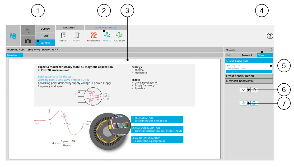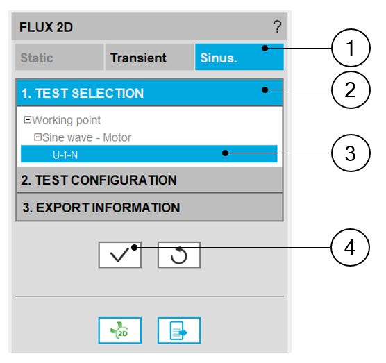 | 1 | Selection of application (SINUS or TRANSIENT) in which the model must be built for Flux® 2D |