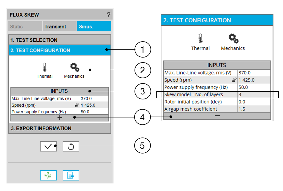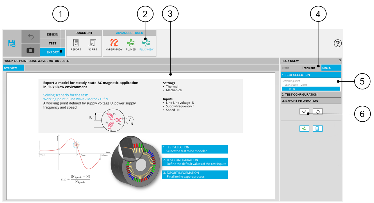 | 6 | Buttons to validate inputs and export the python file for building the model in Flux® Skew environment. |