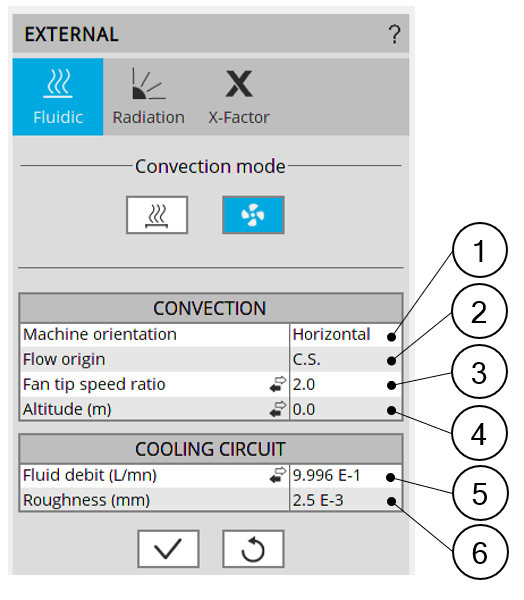 the user). This input exists only when a cooling circuit has been defined by the user in the MACHINE subset, HOUSING panel, CIRCUIT setting. It corresponds to the fluid flow debit or velocity existing in the cooling circuit. This input will be considered for every thermal computation, including the tests (and not only for the model evaluation in the external cooling design environment). |