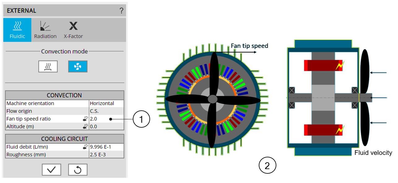 coefficient. (depending of the input mode selected by the user). This input describes the forced convection phenomenon existing on the outer surfaces of the frame and of the end caps. The fan tip speed ratio describes the ratio between the fluid velocity and the tip speed of the rotor. This describes the behavior of a shaft mounted fan which rotation depends of the speed of the rotor. Then, when using this input, the external fluid velocity along the frame will be proportional to the rotation speed of the rotor |