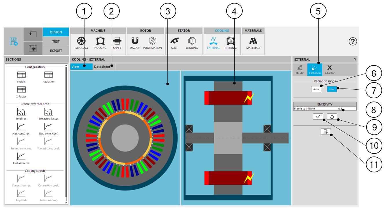 8 Input related to the radiation corresponding to the selected radiation mode. In user mode, only the Frame to infinite emissivity must be define.
