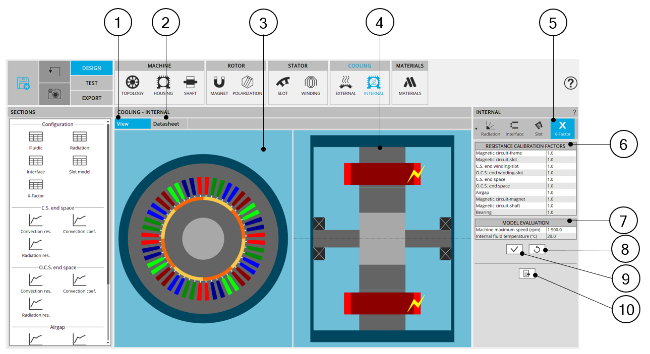 The X-Factor panel also contains a set of parameters defining the internal cooling (coolants temperature and rotor speed) allowing the user to evaluate the thermal model embedded.