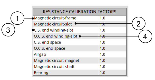 | 4 | Opposite Connection Side end winding – slot. This calibration factor tunes the conduction resistance between the slots (meaning In-slot winding) to the Opposite Connection Side end winding. |