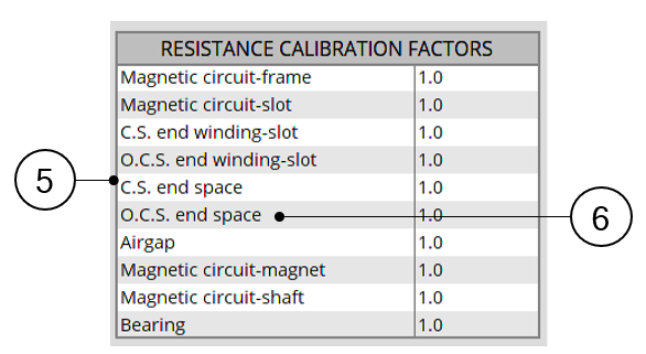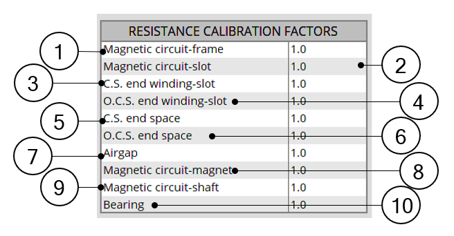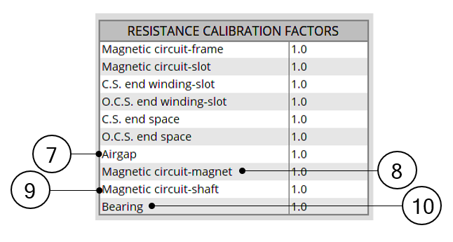 | 10 | Bearings. This calibration factor tunes the resistances existing across the Connection Side bearing and the Opposite Connection Side bearing. These resistances are the resistances computed directly from the bearing equivalent airgap thickness set by the user in INTERFACE settings. |