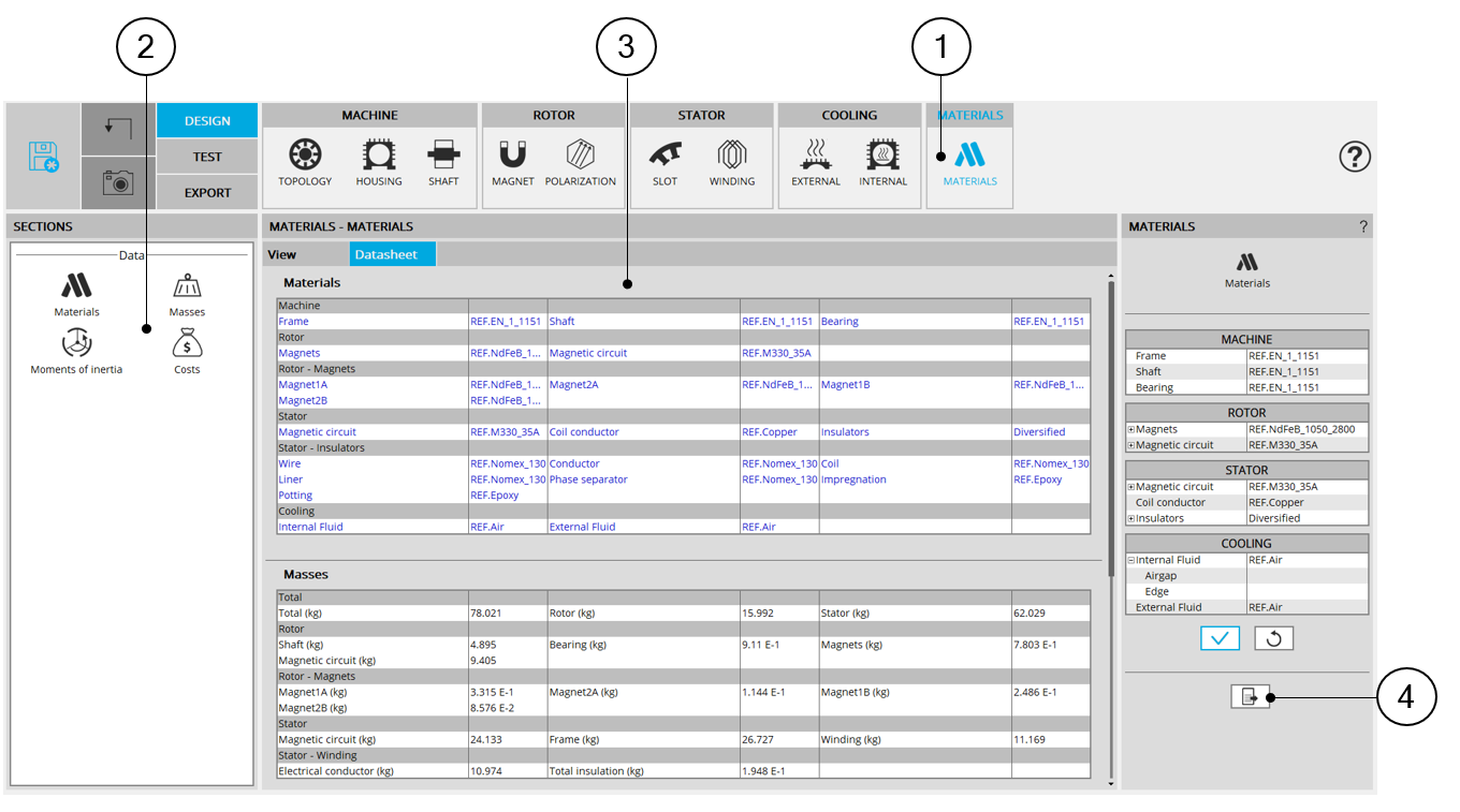 3 Material datasheet where materials, masses, moment of inertia and costs are displayed