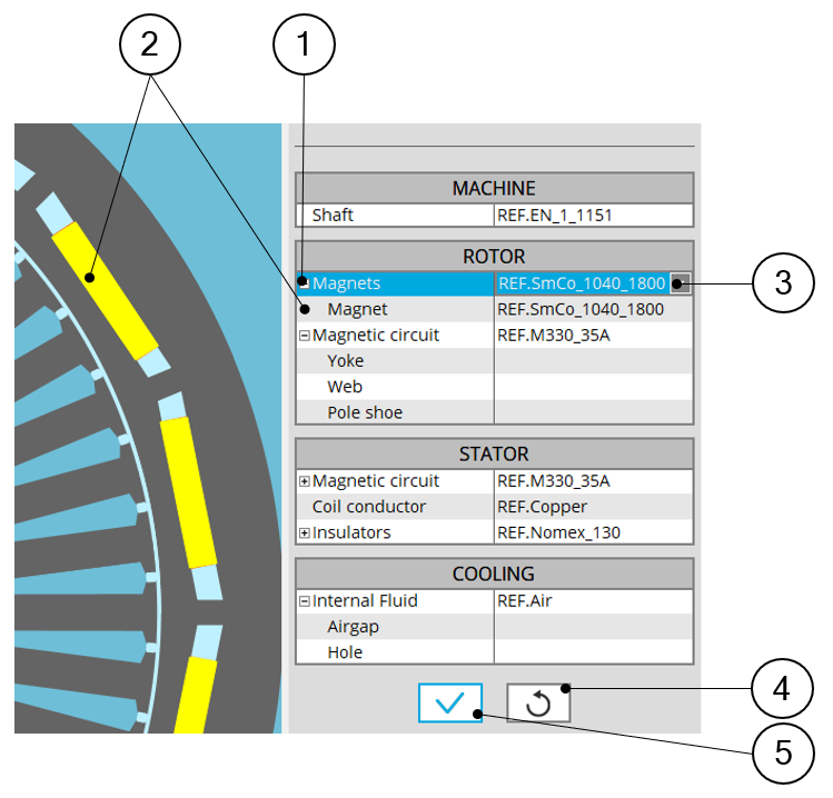| 3 | Expand the material list to choose a magnet material to assign to the selected magnet. |