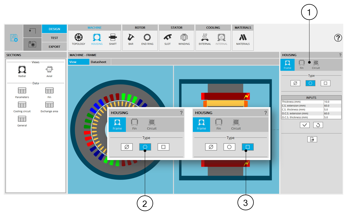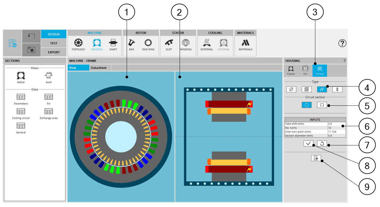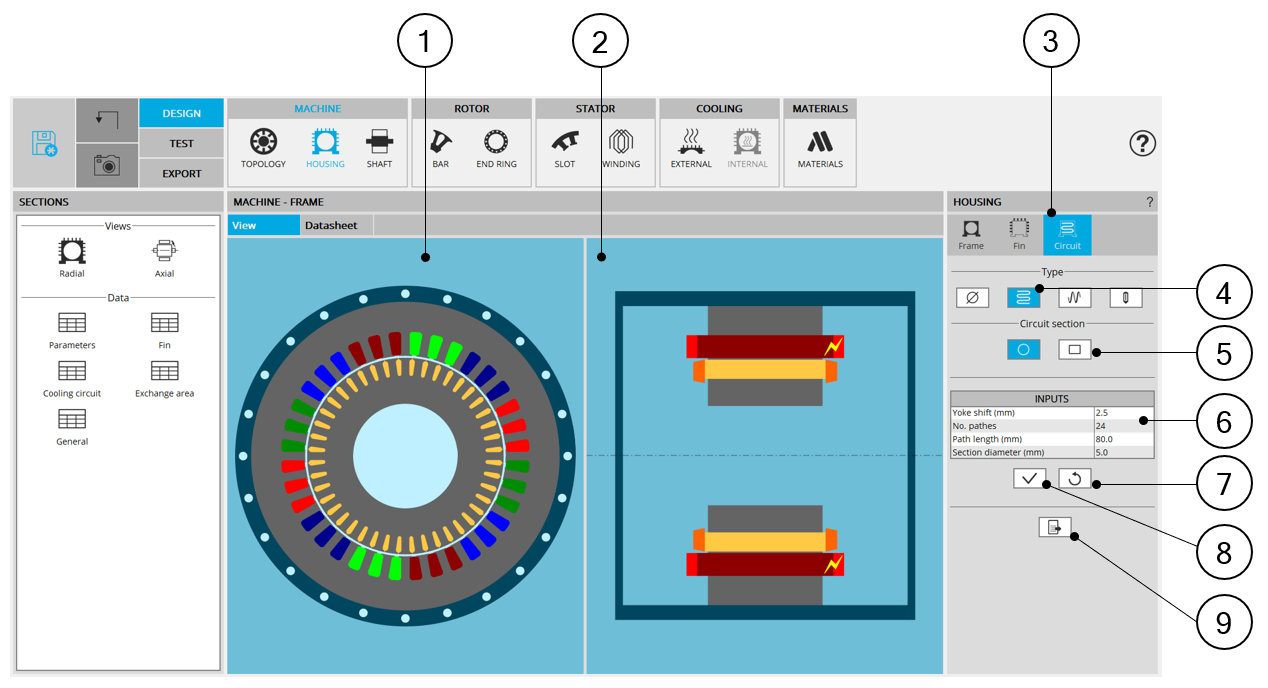 Access to the “Cooling circuit” area is unlocked when a frame is defined, when its shape is circular or square.