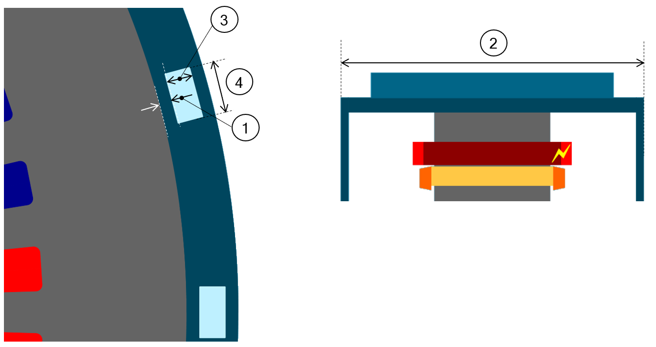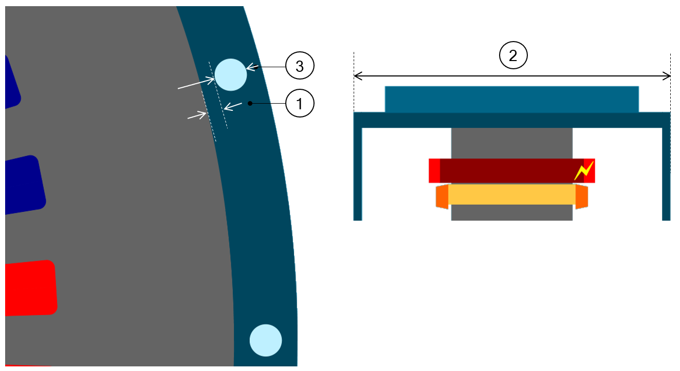 1 Radial view of the motor, including the housing topology with cooling circuit topology and dimensions.