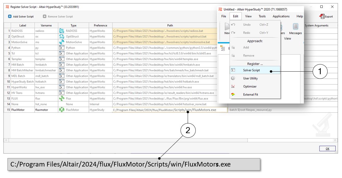 Before starting new studies in HyperStudy® by using connectors exported from FluxMotor, FluxMotor must be registered as a new solver script in HyperStudy®.