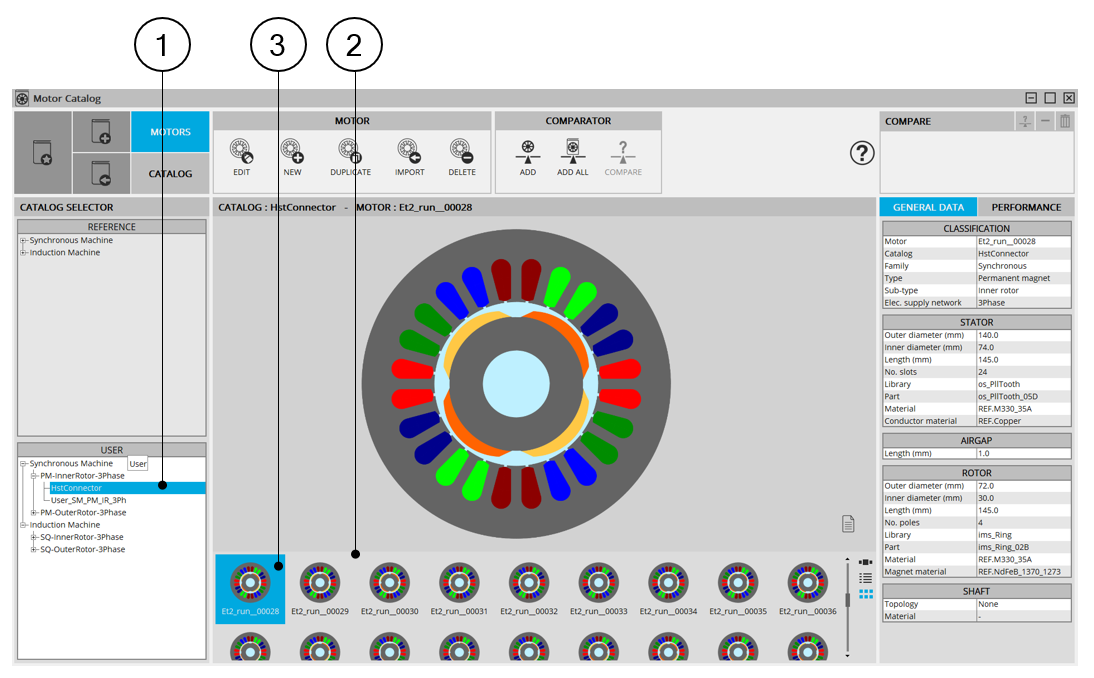 | 3 | Each motor can be selected, visualized and edited in the Motor Factory, to be evaluated more in depth |