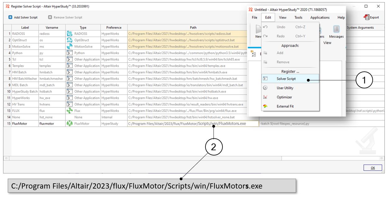 Before starting new studies in HyperStudy® by using connectors exported from FluxMotor®, FluxMotor® must be registered as a new solver script in HyperStudy®.
