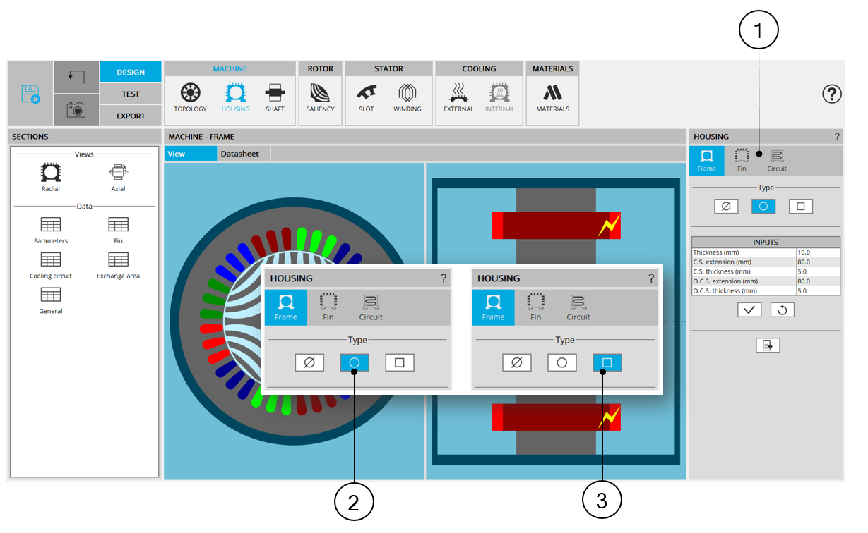 Access to the “Cooling circuit” area is unlocked when a frame is defined, when its shape is circular or square.