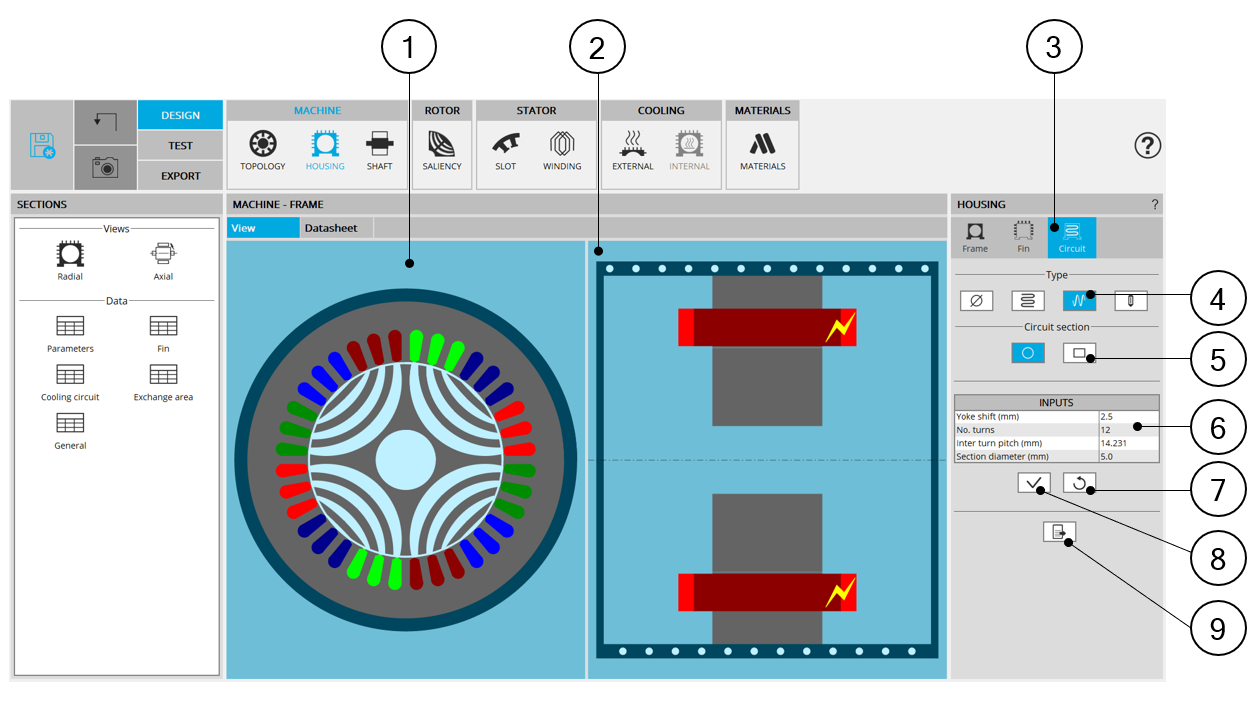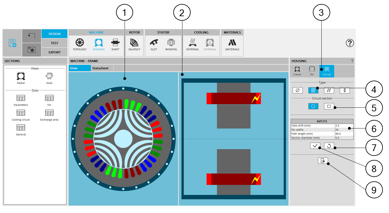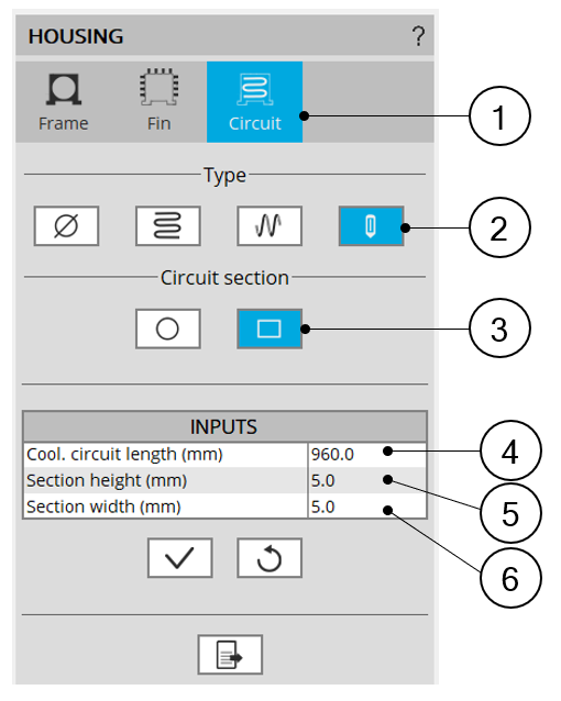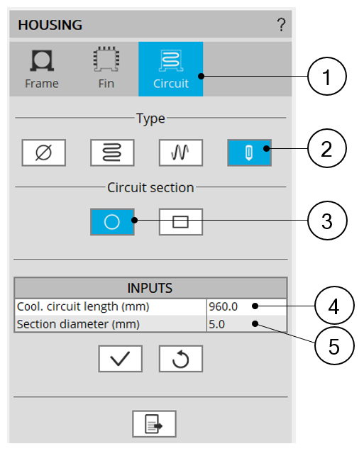 | 1 | The section Circuit (Cooling circuit) is selected to define the type and dimensions of the cooling circuit. |