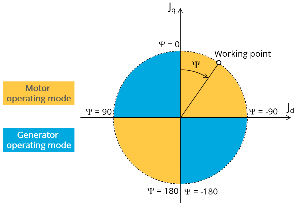 Considering the vector diagram shown below, the “ Control angle ” is the angle between the electromotive force E and the electrical current (J) (Ψ = (E, J)). It is an electrical angle. It must be set in a range of -90 to 90 degrees.