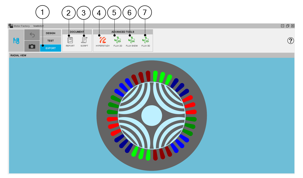 Then, the functions “FLUX2D”, Flux Skew, Flux 3D allow to build and export a model in Altair® Flux® environment (2D, Skew or 3D) for performing advanced studies either with magneto static or transient applications