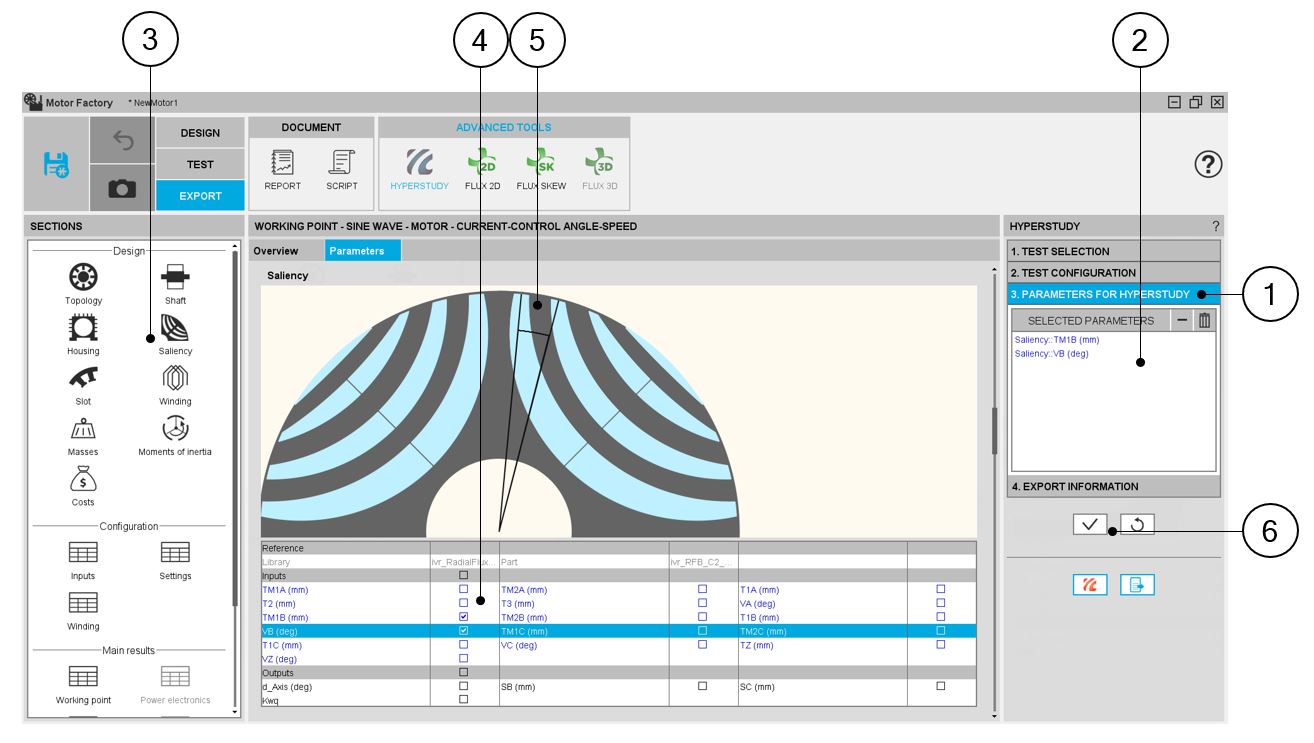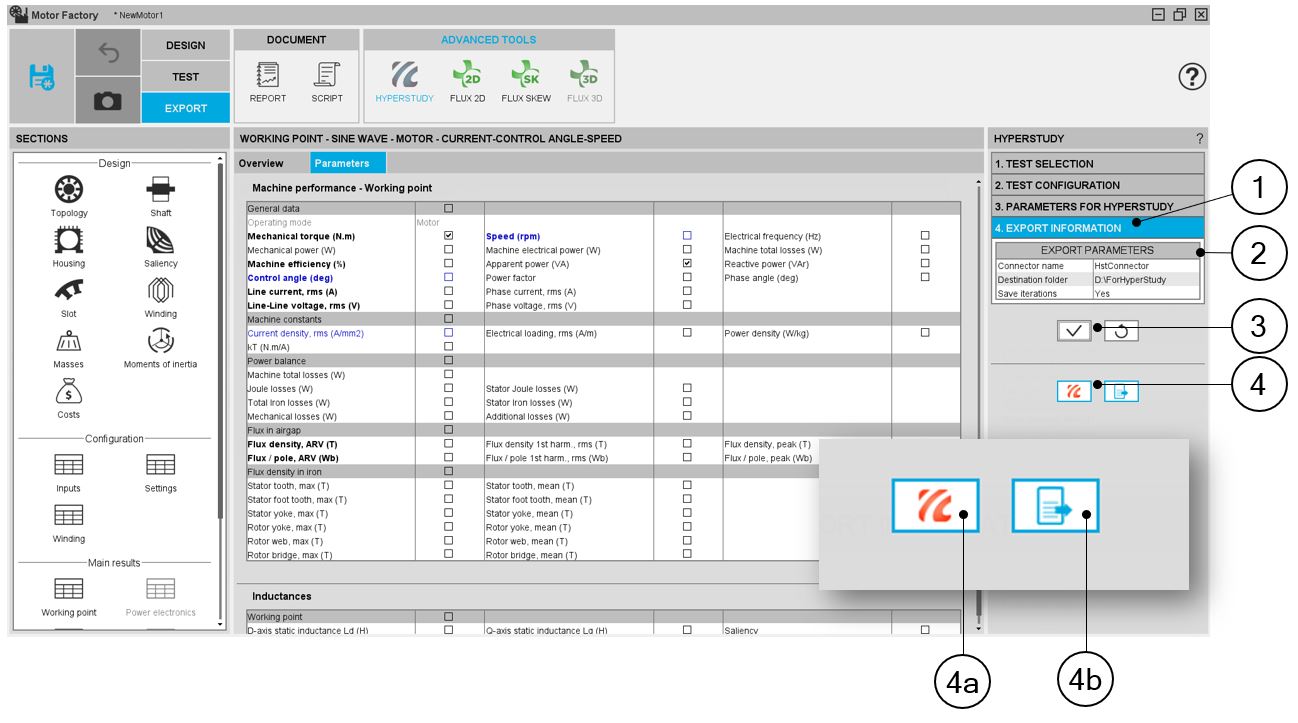 | 4a | To finalize this operation from FluxMotor, a first button allows to directly and automatically launches HyperStudy, builds and load the connector to perform the optimization |