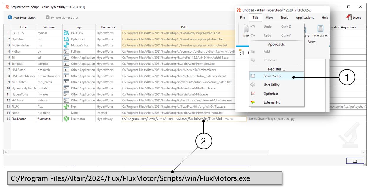 Before starting new studies in HyperStudy® by using connectors exported from FluxMotor® , FluxMotor® must be registered as a new solver script in HyperStudy®.