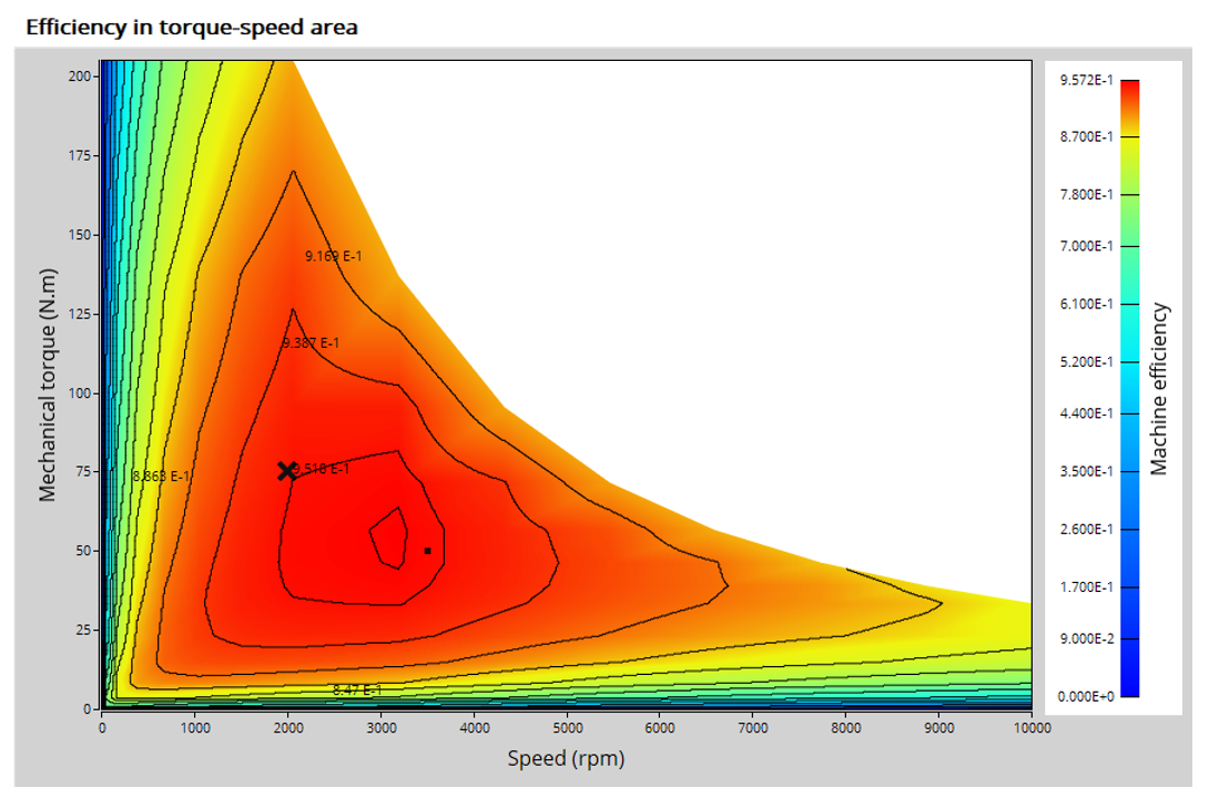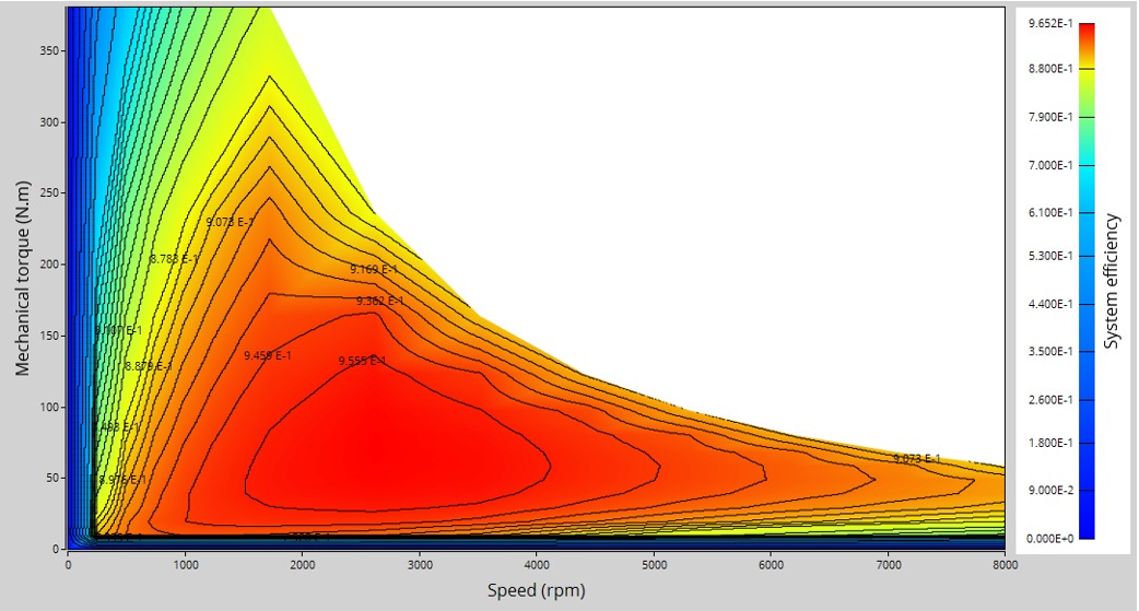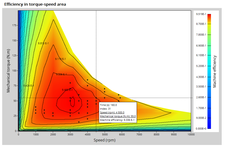 The aim of the test “ Performance mapping – Sine wave – Motor – Efficiency map ” is to characterize the behavior of the machine in the "Torque-Speed" area.