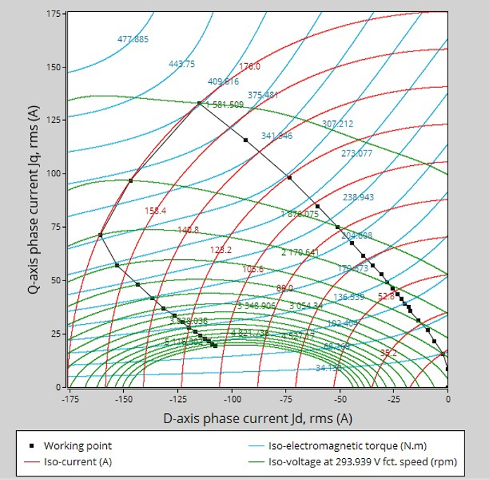 - Characteristic curves in Jd-Jq area - Evolution of the working points in Jd-Jq plane, with iso-torque, iso-current and iso-voltage.
