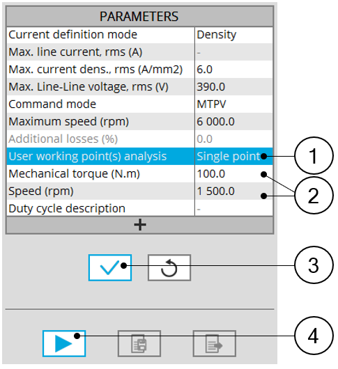User working point analysis = Single point 1 Select the “Single point” option to perform a computation on one working point. 2 Define the targeted working point mechanical torque and speed. 3 Button to validate and take into account the user inputs 4 Button to run the computation -