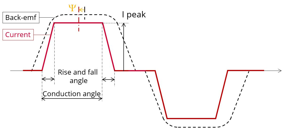 The control angle between the back-emf and the phase current, the value of current and the imposed speed induce the resulting working point. Then, the main corresponding performance are computed and displayed.