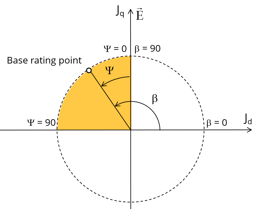 The variation area for is represented by the quarter circle (colored yellow in the diagram). This discretization is necessary to find the working point corresponding to the base speed point of the torque-speed curve.
