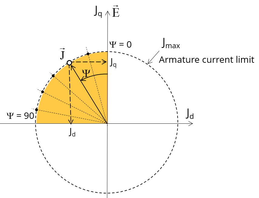 Considering the vector diagram shown below, the control angle Ψ is the angle between the electromotive force E and the electrical current (J) (Ψ = (E, J)).