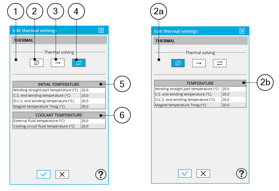 | 2a | Dialog box that allows to define the machine active components winding and magnets temperatures to run test without any thermal analysis. |