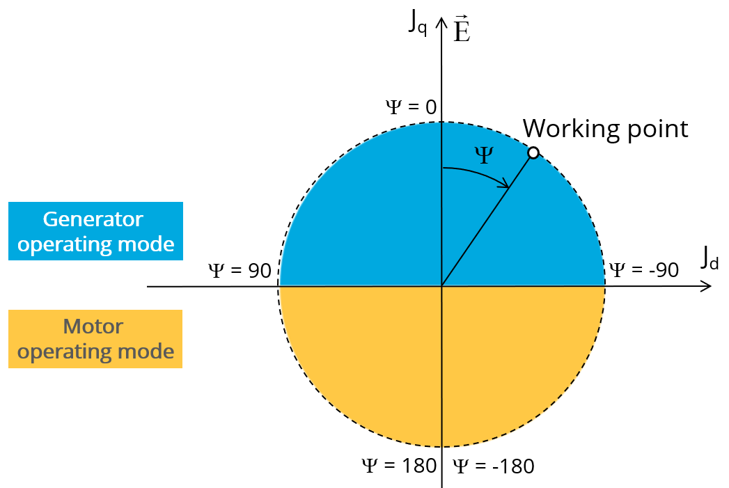 Considering the vector diagram shown below, the “ Control angle ” is the angle between the electromotive force E and the electrical current (J) i.e. (Ψ = (E, J)).