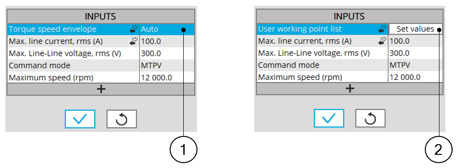 Two ways for defining the working point list 1 Automatic mode: working points are automatically considered on the torque-speed envelope 2 We can define our own working point list by filling in a table with the targeted speeds and torques -