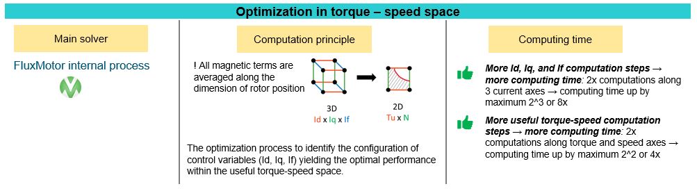 Here below, the process is summarized for a quick understanding of how it is carried out and which factors can influence the overall performance in terms of accuracy and computing time. In general, the machine performance needs to be evaluated within its operational range before looking for optimal configuration of control variables for each torque-speed working point.