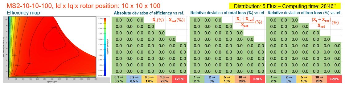 Each model is compared to the reference model, analyzing efficiency, total losses, and iron losses within the map according to the following criteria:- Efficiency: Deviation calculated as the absolute difference between the efficiency percentages of the actual and reference models.