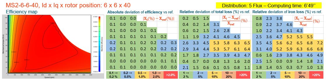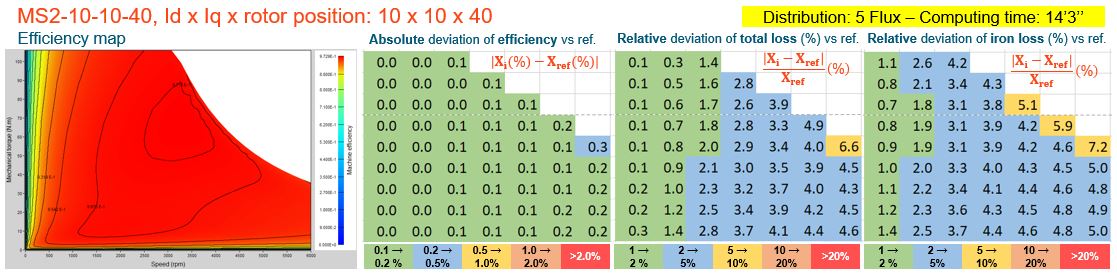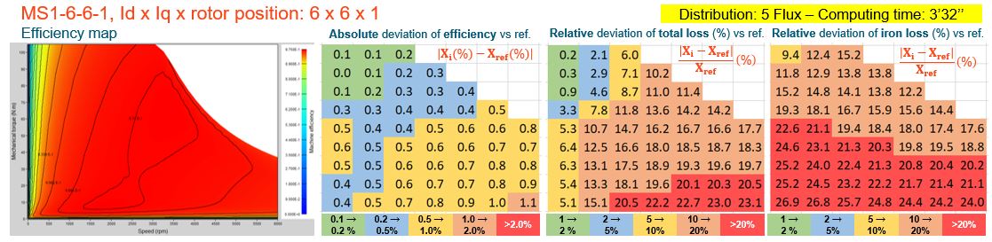 Example of SMWF efficiency tests – Reference model with 6 steps for current and 1 rotor position (without rotor position dependency) Observations:- Computation times range from 3 minutes to approximately 30 minutes, progressively decreasing from the first to the sixth configuration as the number of computations decreases.