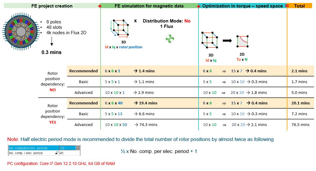 - The advanced setting delivers very accurate results but requires significant computing time, taking up to 4 minutes without rotor position dependency and 15 minutes with it. Memory issues may arise as finer characteristic space requires more memory resources. Refer to FluxMotor Supervisor help for guide on how to setup memory configuration of FluxMotor.