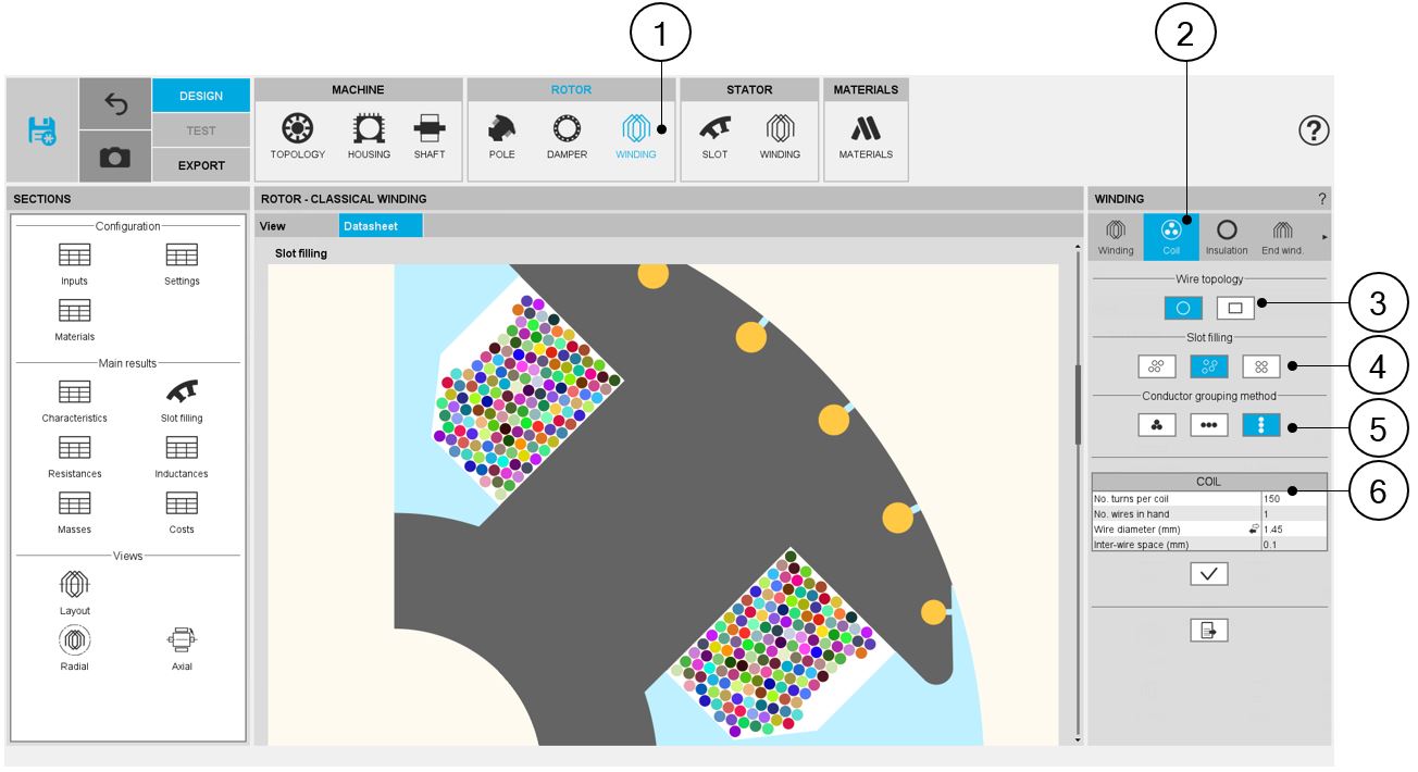 | 2 | Coil settings allow the user to describe the coil composition (turns, wires, and dimensions) and how to fill the slot. |