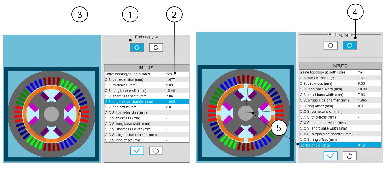 | 3 | Definition of each end ring geometrical input, with the corresponding arrow on the axial view of the machine |