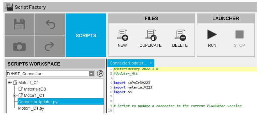 To apply this new process, one must open FluxMotor 2023 and get into Script Factory. Then, in the Script Workspace, one must select the folder in which the previous connector is stored.