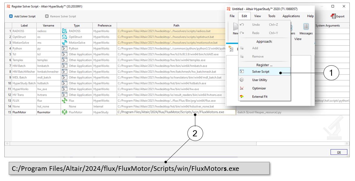 Before starting new studies in Altair® HyperStudy® by using connectors exported from Altair® FluxMotor®, FluxMotor® must be registered as a new solver script in HyperStudy®. This must be defined only while using the coupling for the first time.