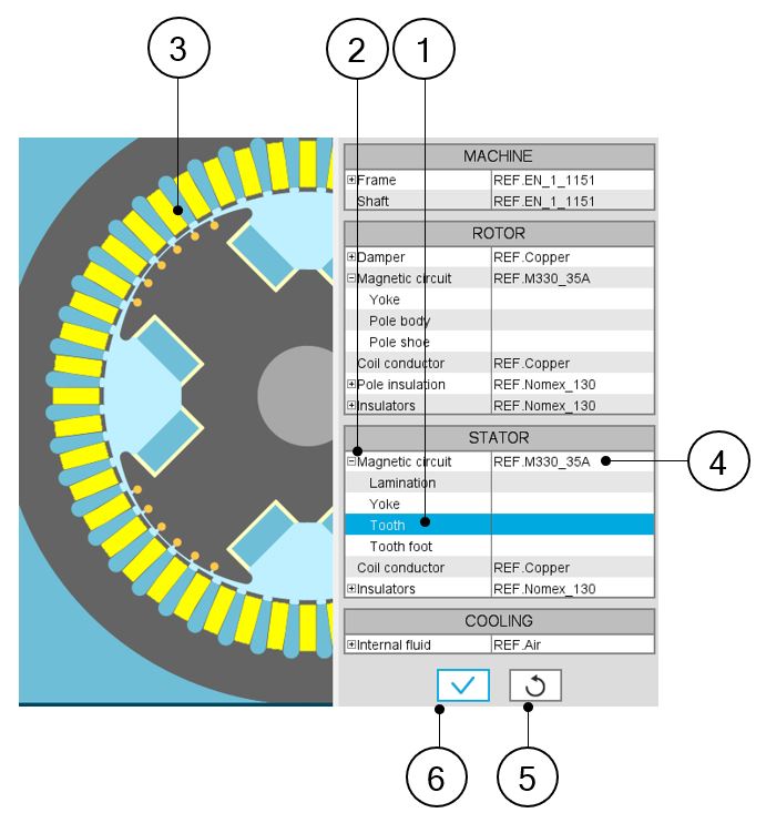 magnetic circuit. Only one material can be assigned to the stator magnetic circuit. In our example, it is not possible to assign different materials to sub regions like Yoke, Tooth and Tooth foot for example. |