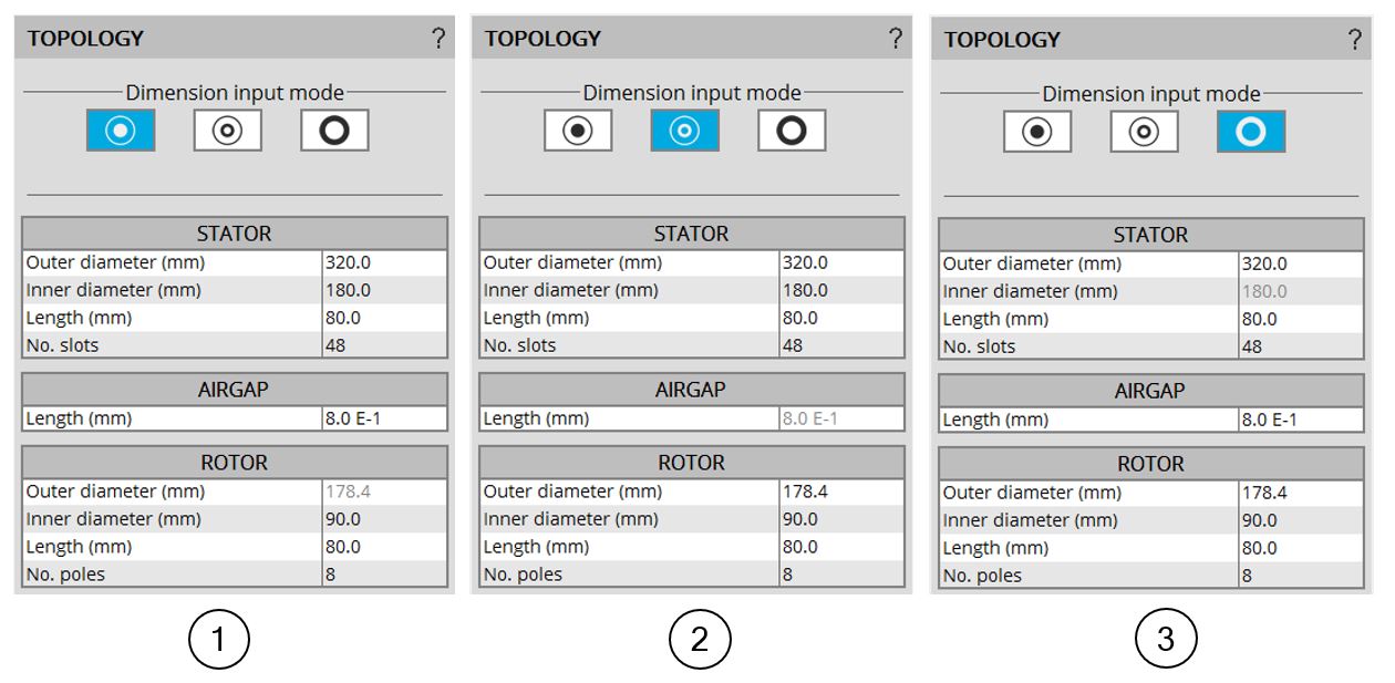 In the topology sub area, three ways are possible to define the structural data of the machine based upon the diameters and the airgap. They are illustrated below.