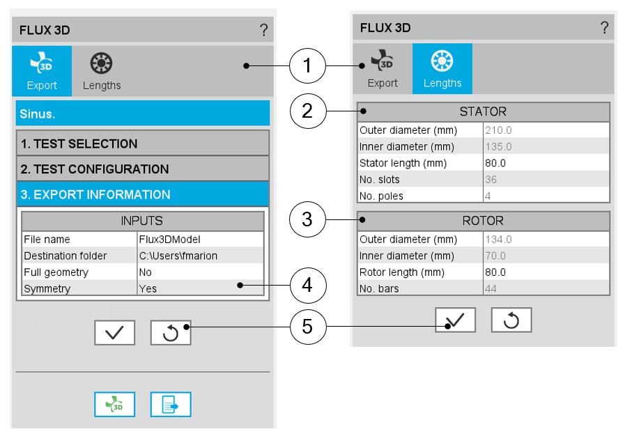 | 1 | Tab selector to define general export parameters and axial lengths in Flux® 3D environment |