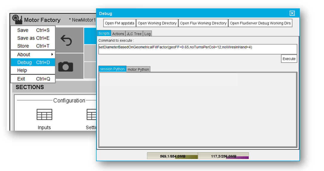 From the drop-down menu available on the left top part of Motor Factory, it is possible to open a “Debug” dialog box, in which the script commands can be written and executed.