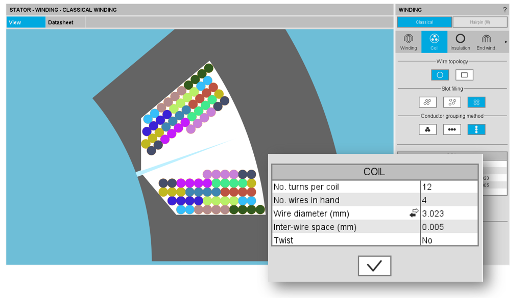 In this example, the goal is to find the wire diameter, which allows to define a geometric fill factor equal to 0.65 by considering a coil built with 12 turns and 4 wires in hand (in parallel).