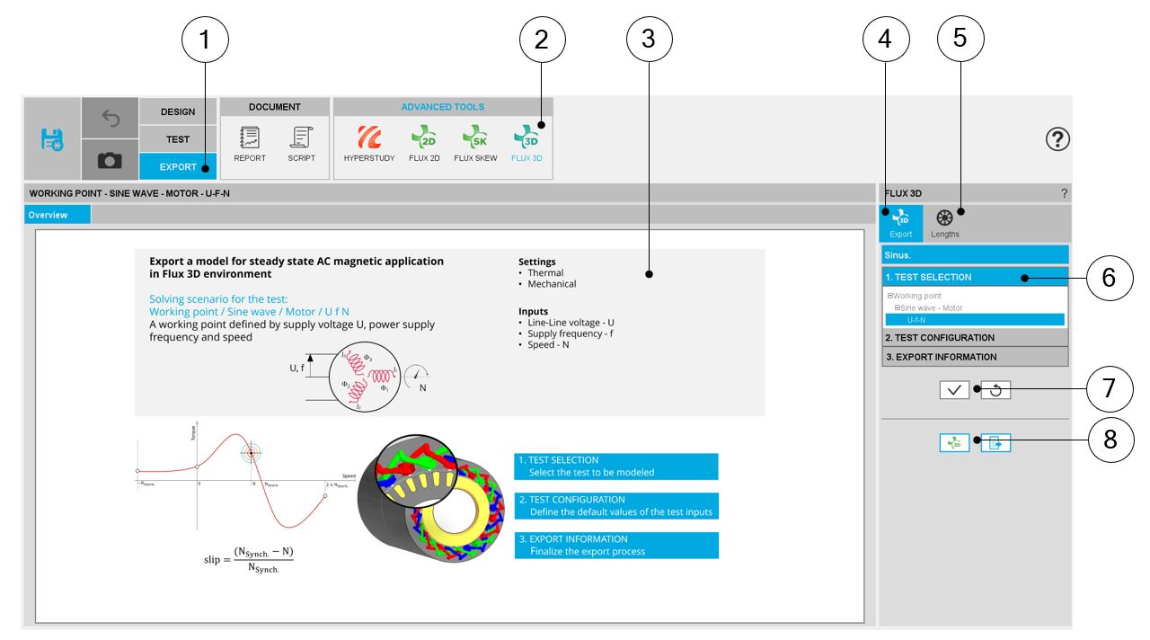 | 8 | Buttons to export the python file for building the model in Flux® 3D environment or to launch directly Flux® 3D. |