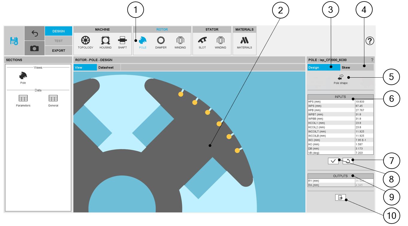 | 1 | Selection of the ROTOR subset: POLE panel (click on the icon POLE) |
