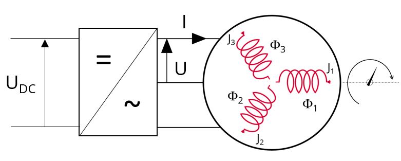 In this case, the line-line voltage is computed from the DC bus voltage (DC bus voltage before inverter UDC) and the Inverter control strategy set in power electronics settings.