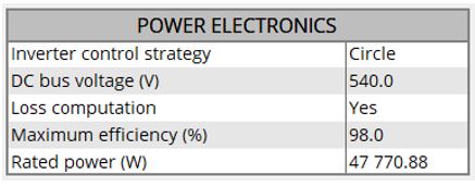 This parameter defines the maximal efficiency that the power electronics stage can reach. This efficiency can correspond to the efficiency of an inverter or a variable speed drive.