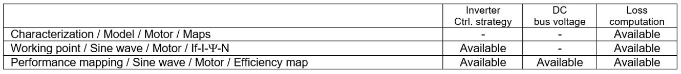 The losses and the efficiency are computed for the machine, the power electronics stage and the system. The “system” gathers the machine and the power electronics stage.