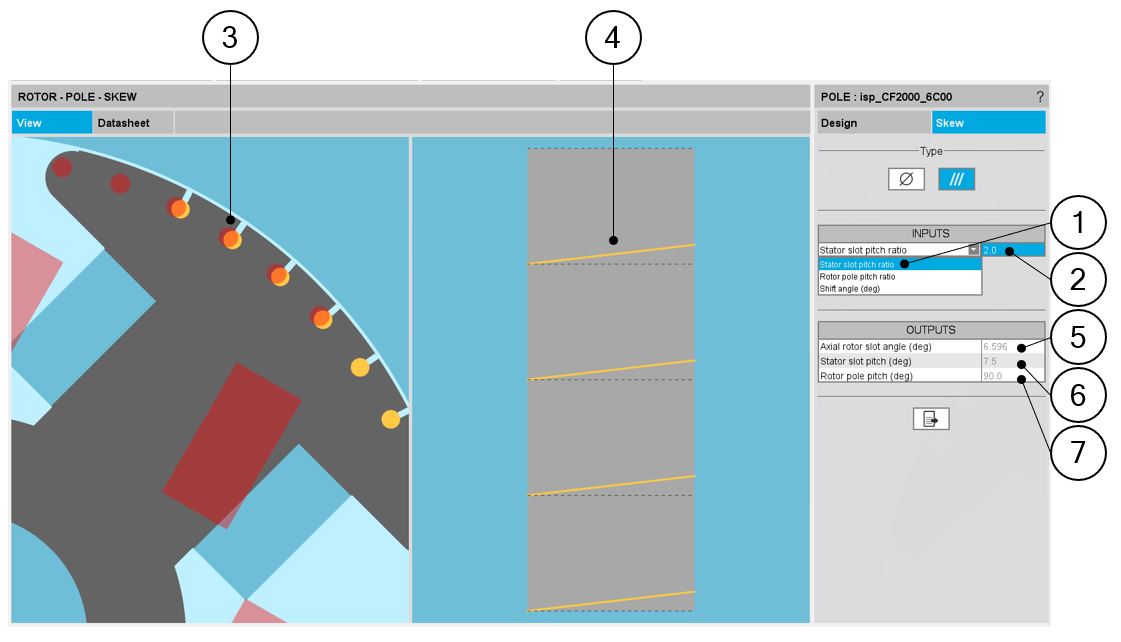 | 1 | Choose the definition mode of the skew: Stator slot – Rotor slot – Shift angle |