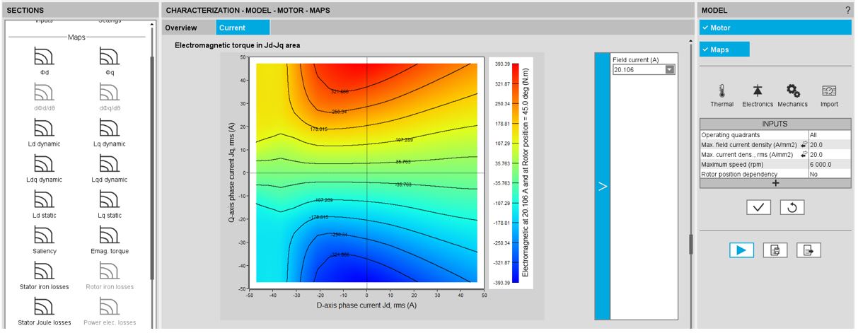 Maps are mainly function of the following user inputs: the maximum value of the field current, the maximum value of the line current, the speed, the number of quadrants to be considered, and the rotor position dependency.